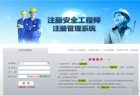 注册人员进入系统首页后点击“注册申请登陆”选项卡,选择证件类型,输入证件号、密码及验证码后,点击“登录”按钮即可登录如图1。