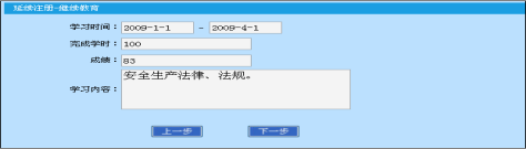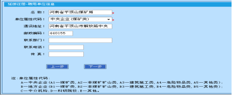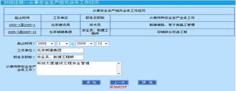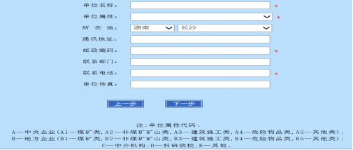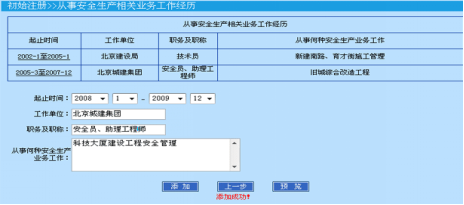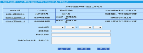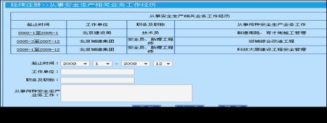 填写单位名称及其它内容,选择单位属性代码,点击“下一步”。进入填写“从事安全生产相关业务工作经历”页面。如图11。